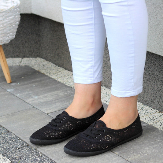 CZARNE MIĘKKIE WYGODNE SZNUROWANE TRAMPKI Z KORONKI