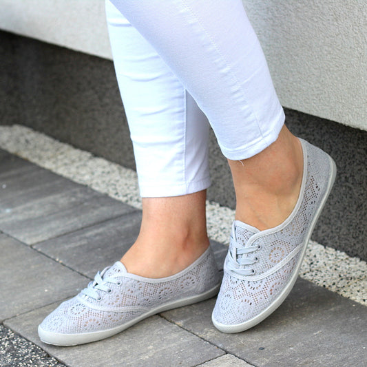 SZARE MIĘKKIE WYGODNE SZNUROWANE TRAMPKI Z KORONKI