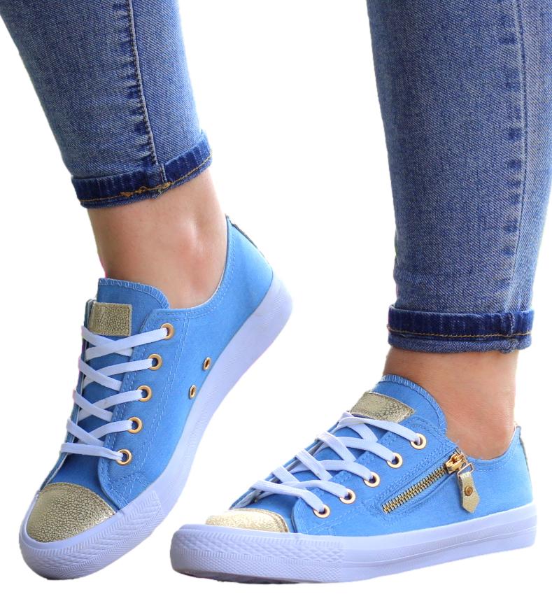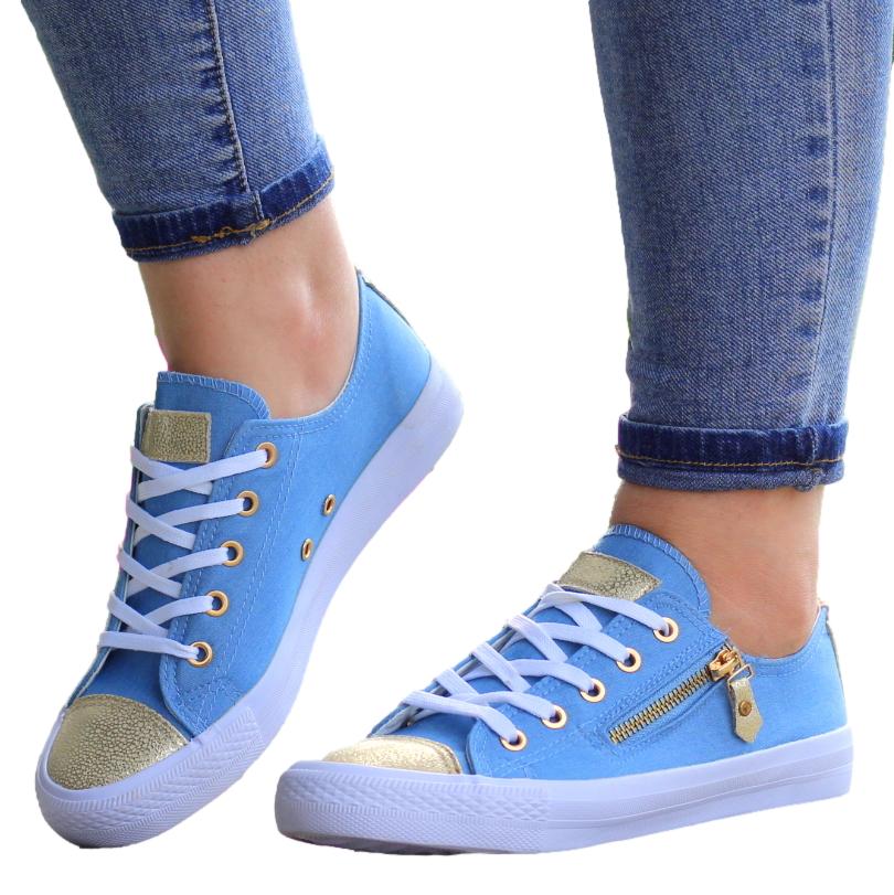 NIEBIESKIE sznurowane gładkie trampki damskie złoty nosek suwak
