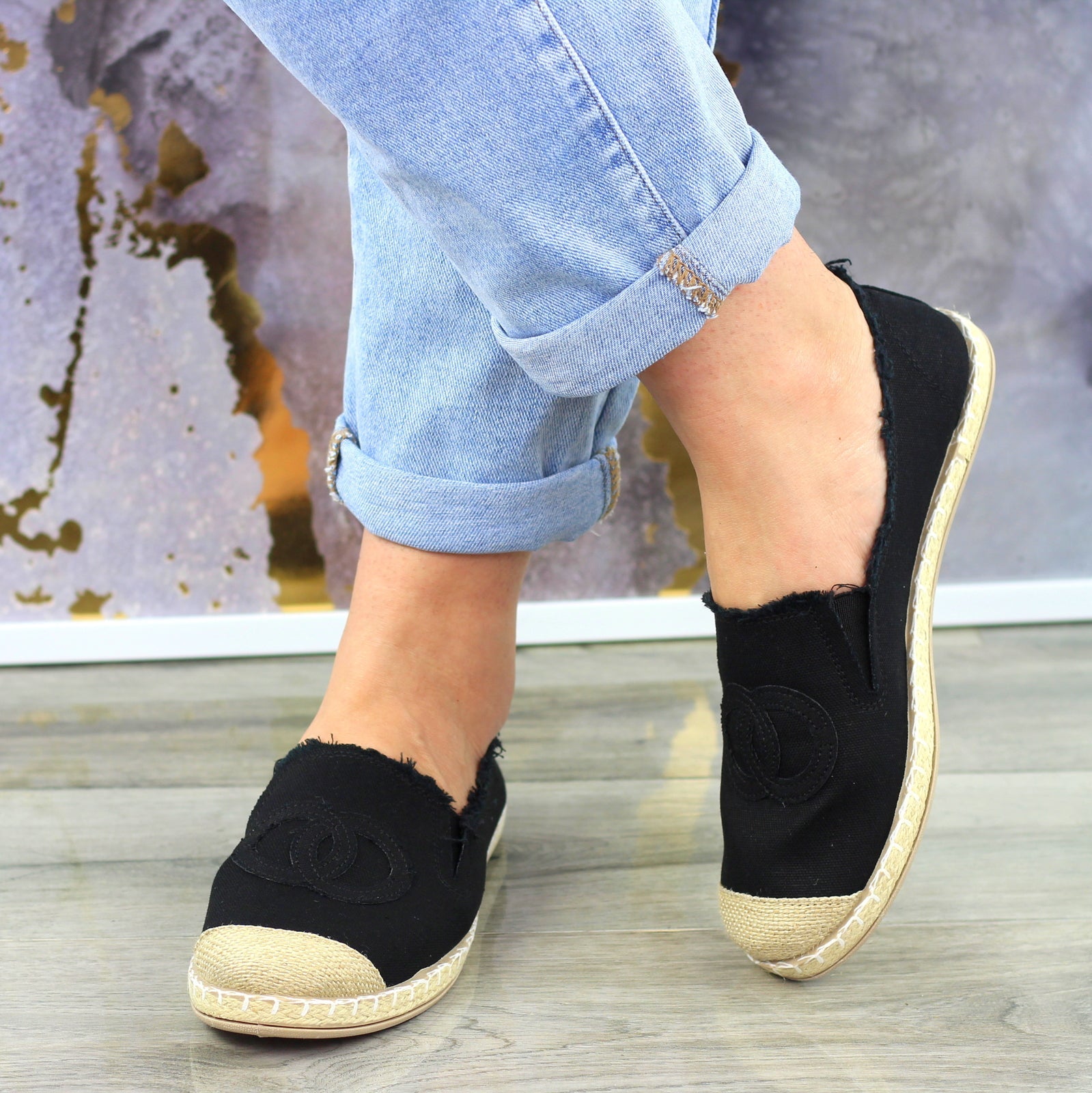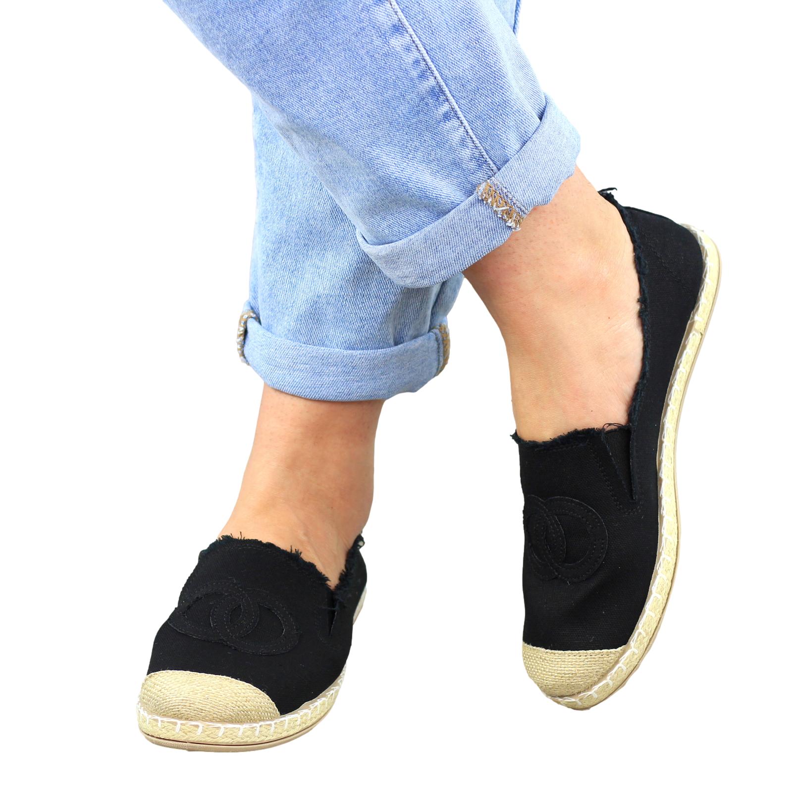 Czarne płaskie espadryle damskie z logowaniem