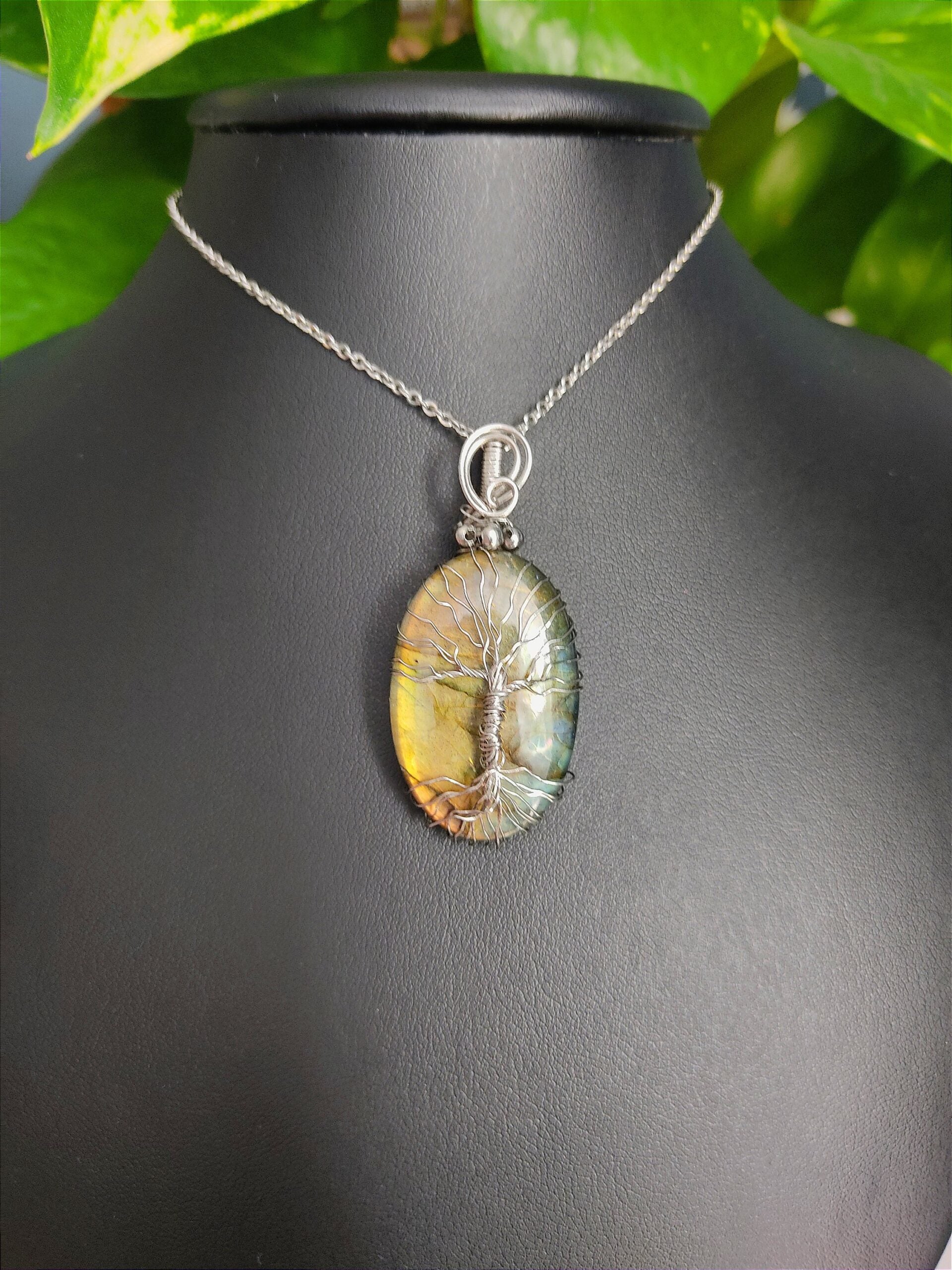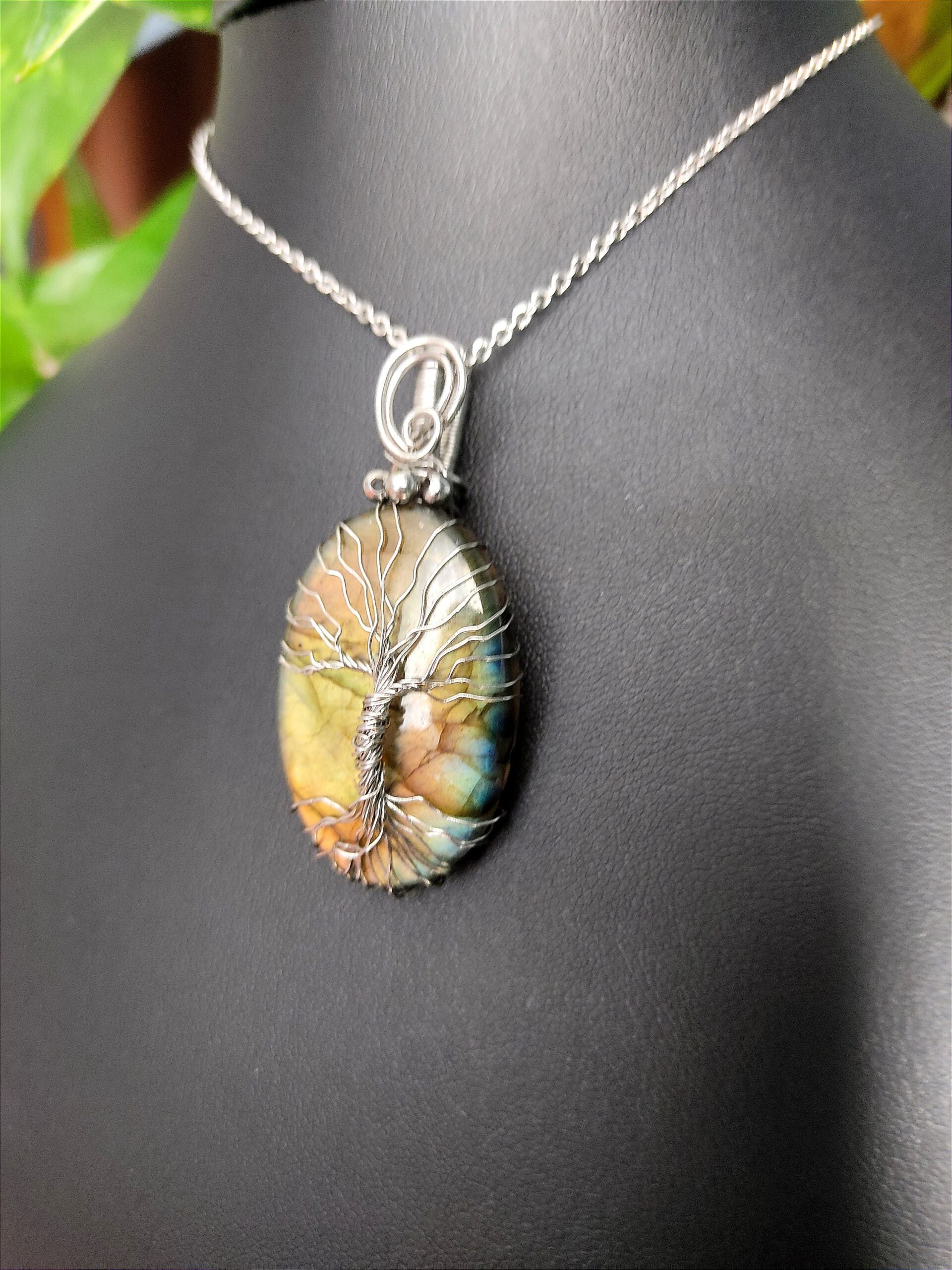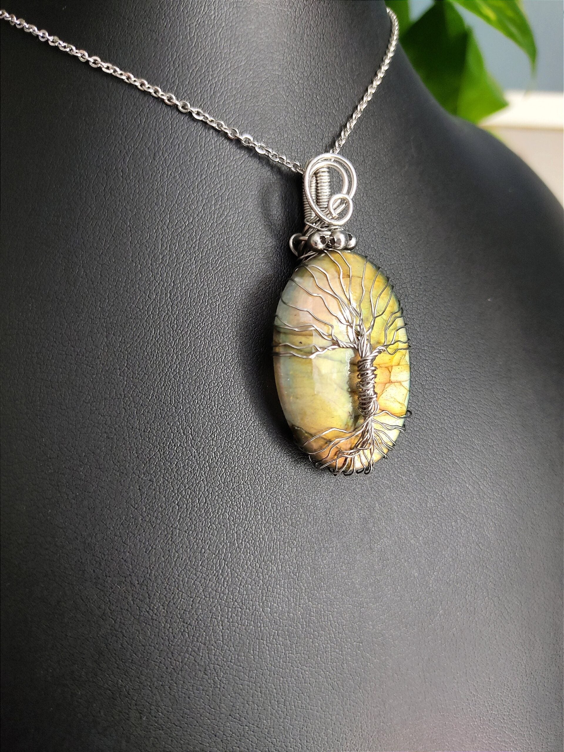Ręcznie robiony wisiorek z labradorytem. Wykonany techniką wire wrapping z drutów ze stali chirurgicznej.