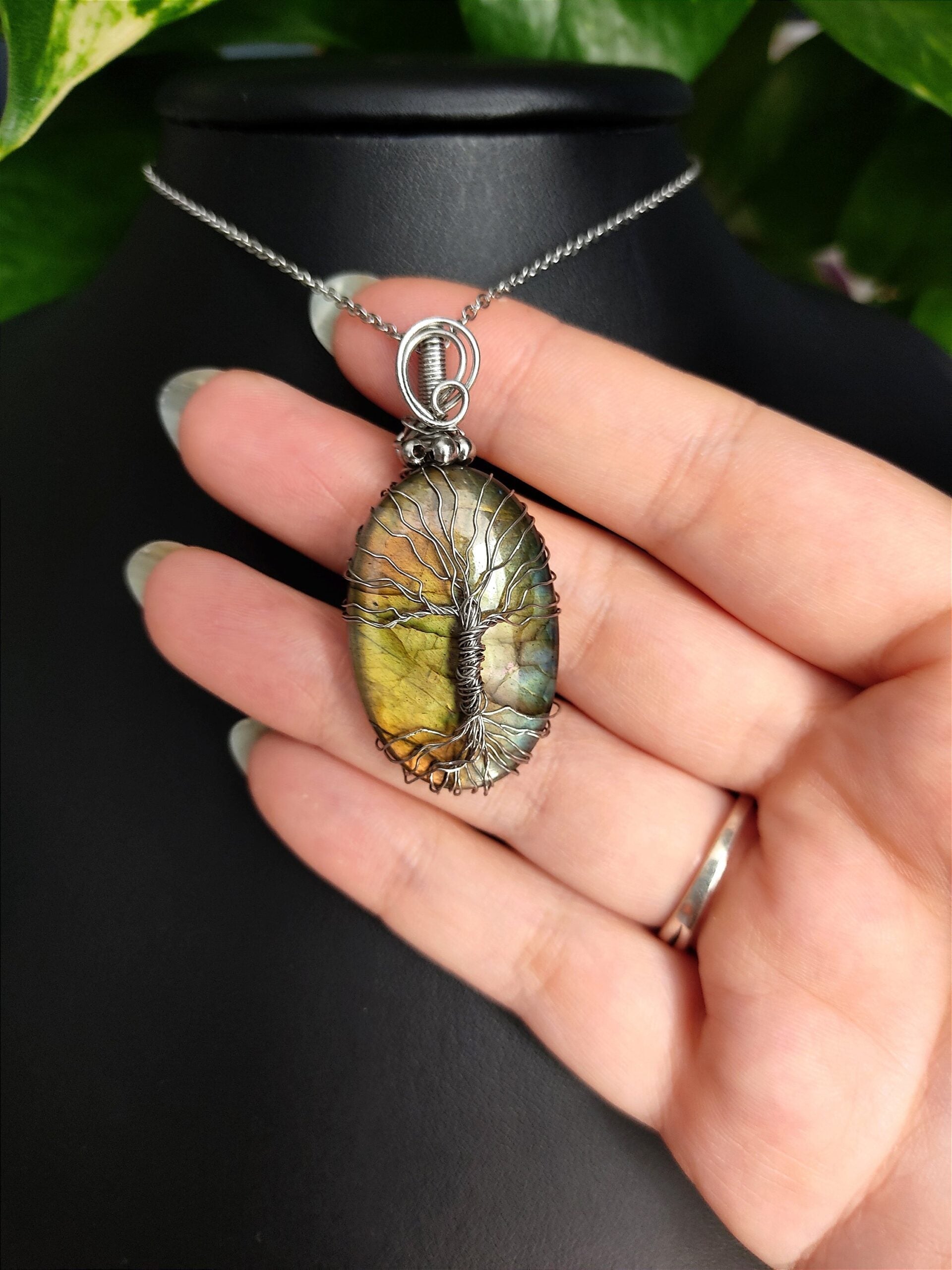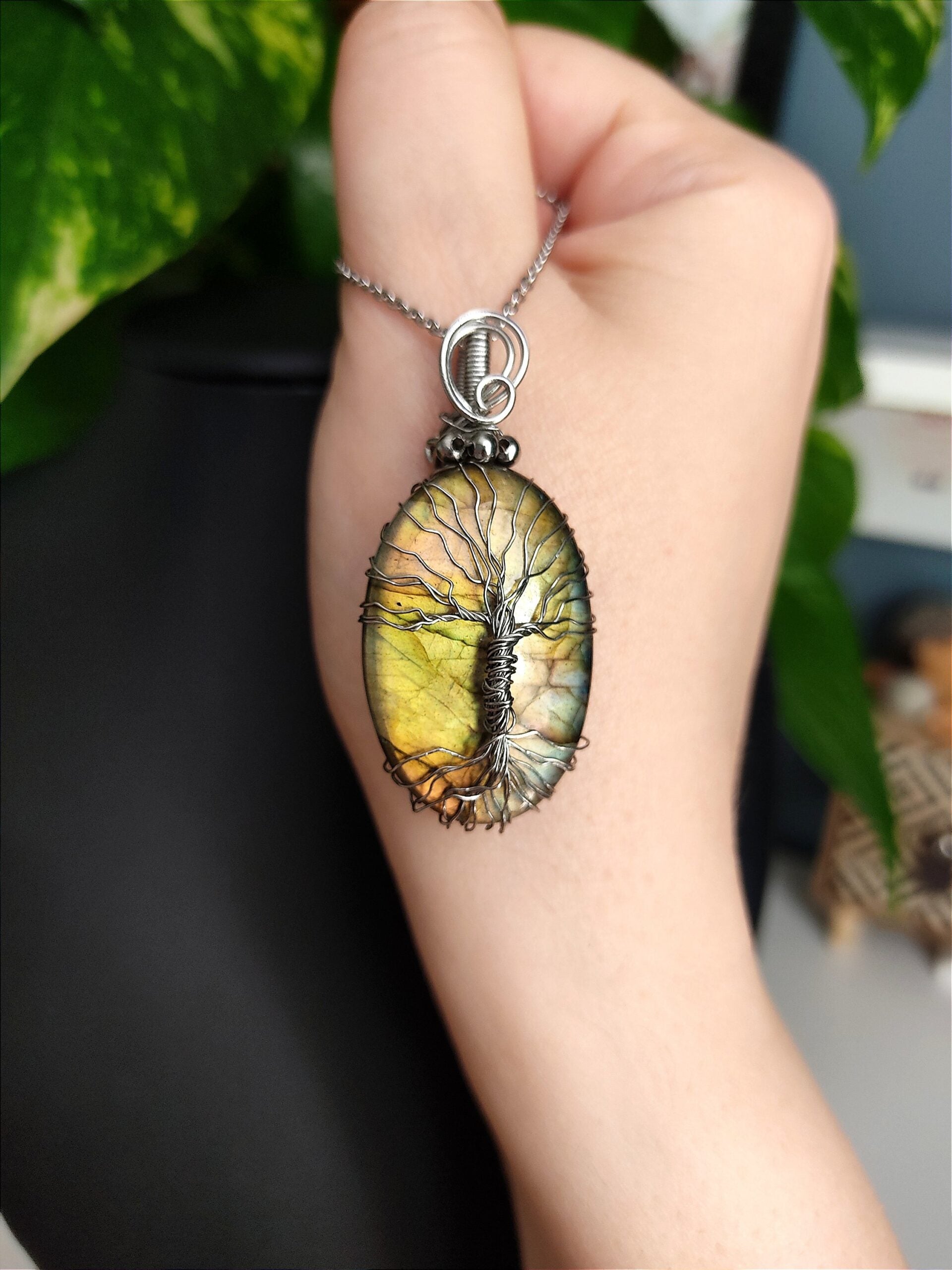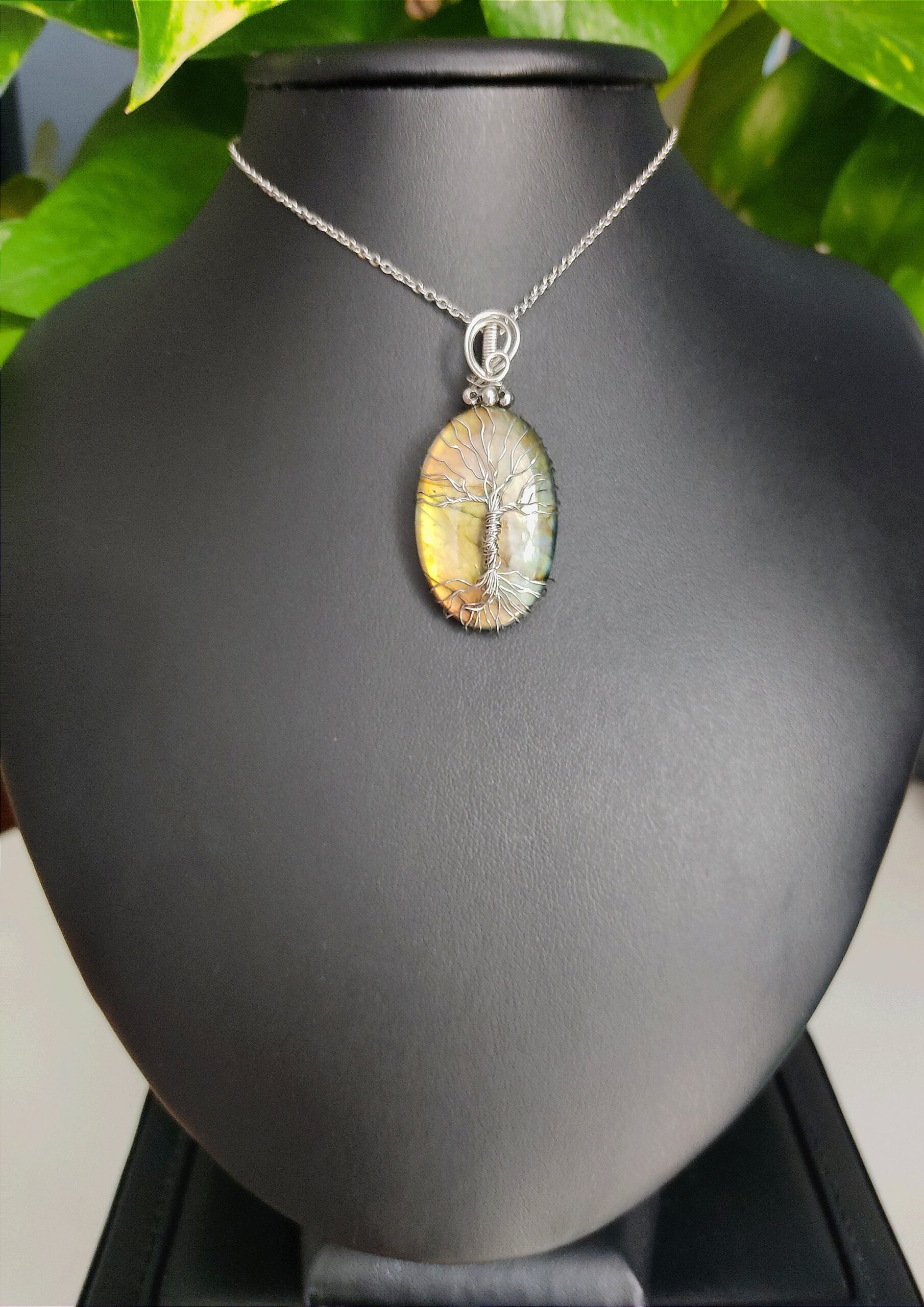 Ręcznie robiony wisiorek z labradorytem. Wykonany techniką wire wrapping z drutów ze stali chirurgicznej.