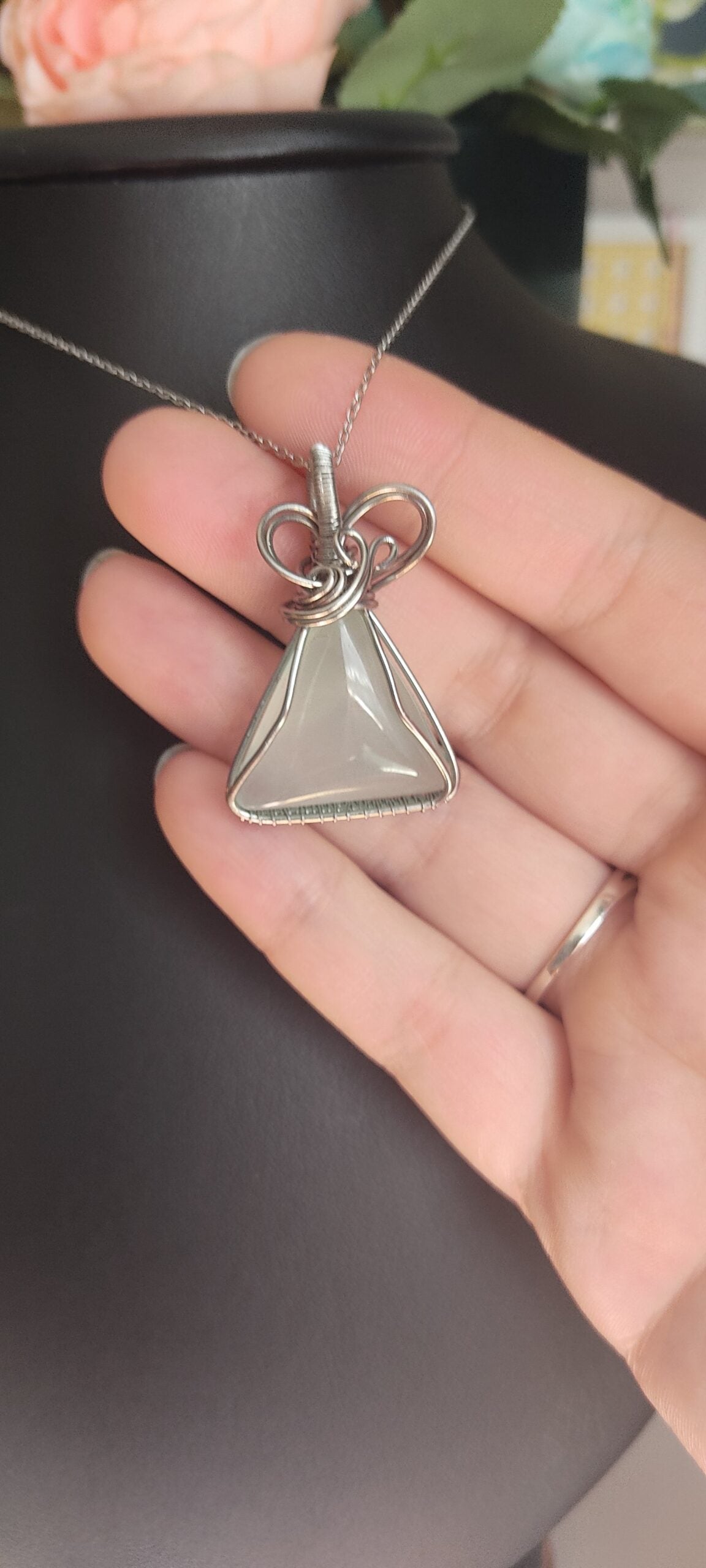 Ręcznie robiony wisiorek z chalcedonem. Wykonany techniką wire wrapping z drutów ze stali chirurgicznej.