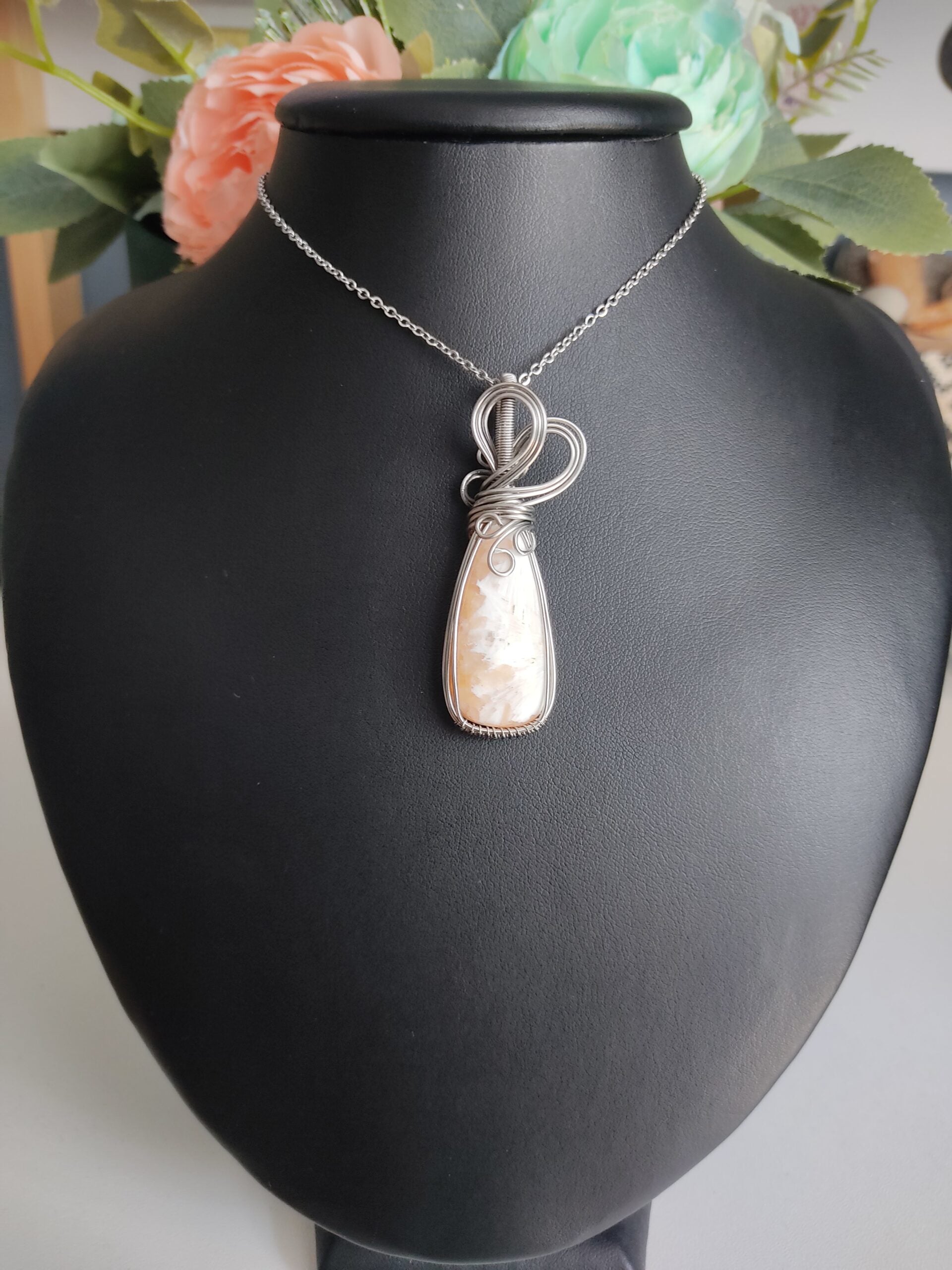 Ręcznie robiony wisiorek z skolecytem. Wykonany techniką wire wrapping z drutów ze stali chirurgicznej.