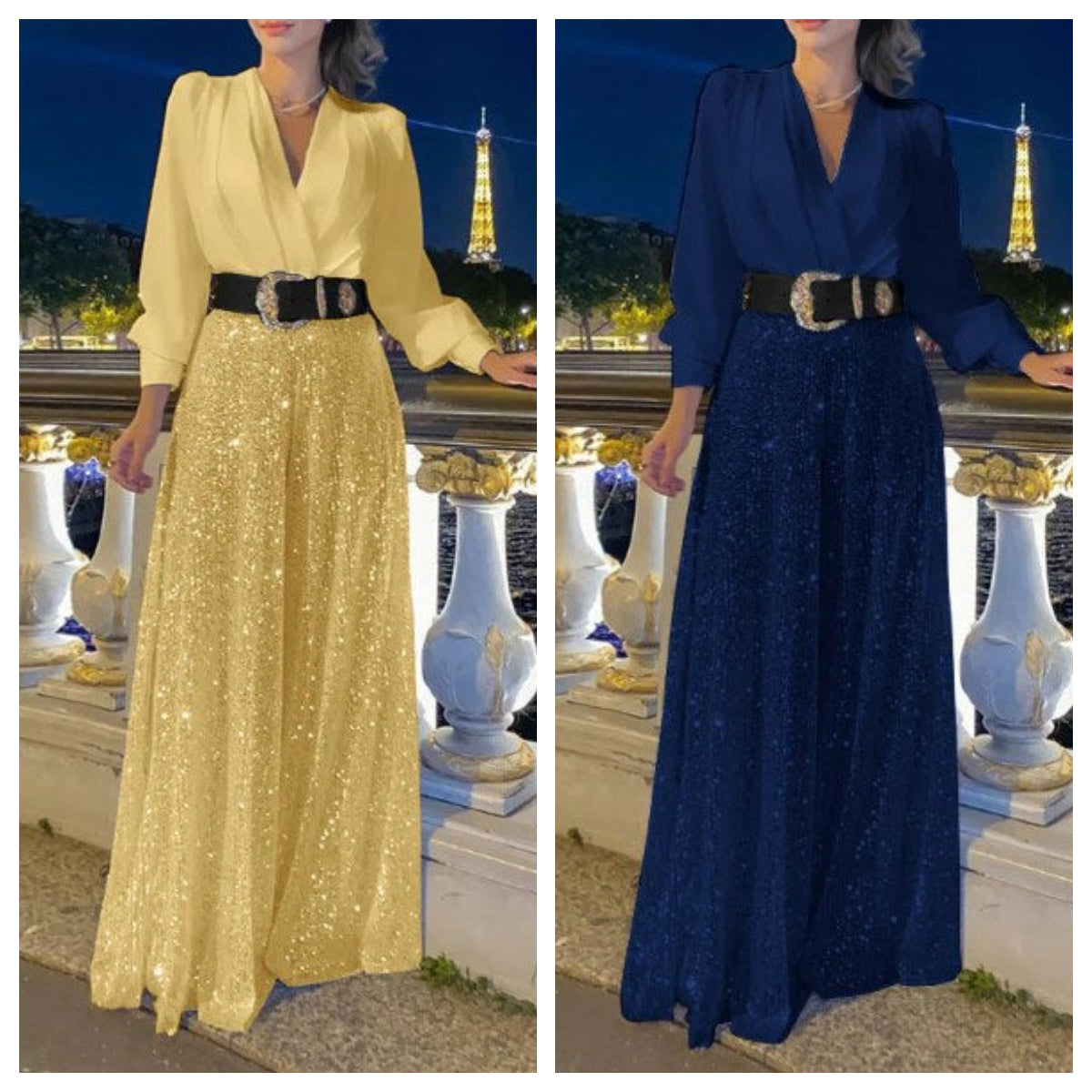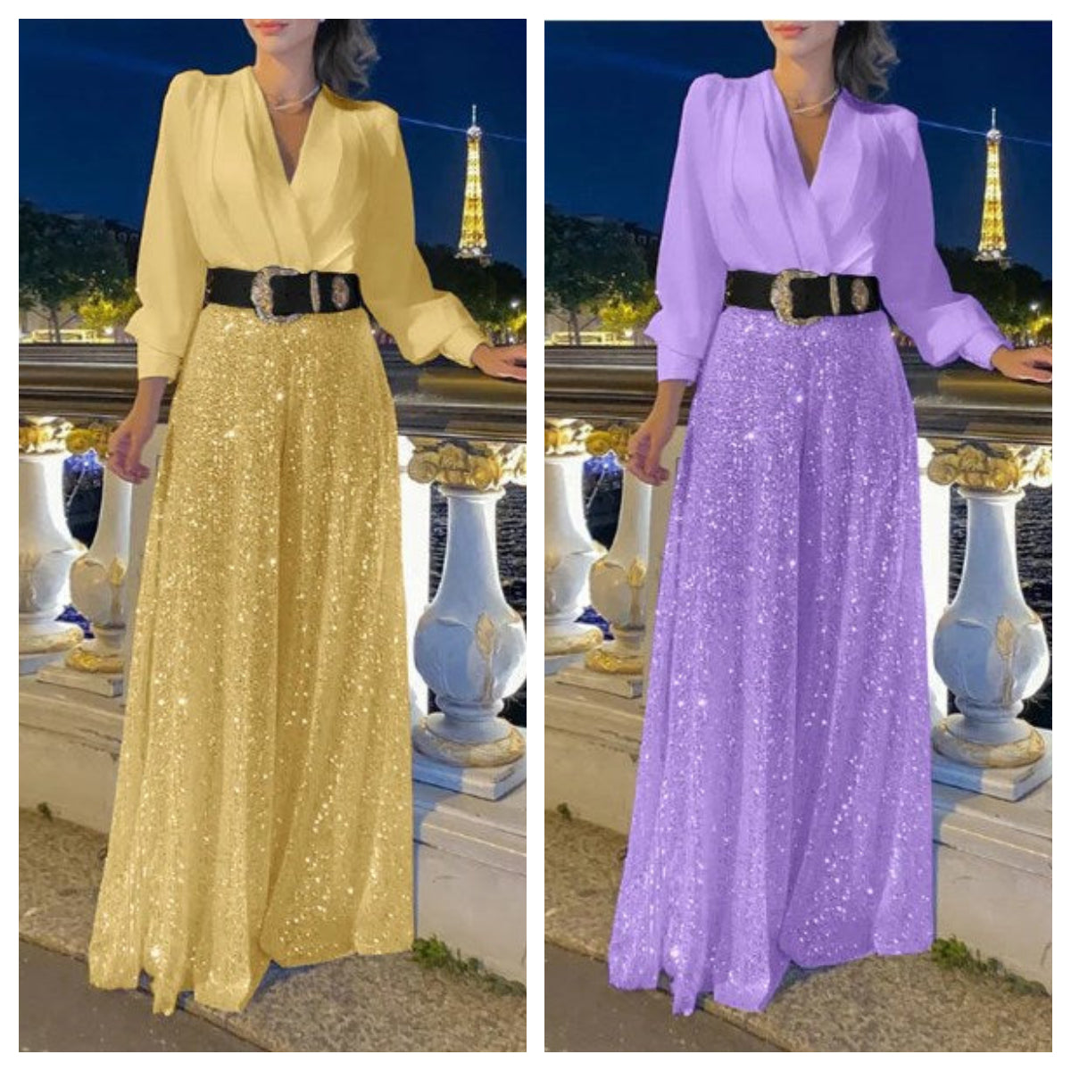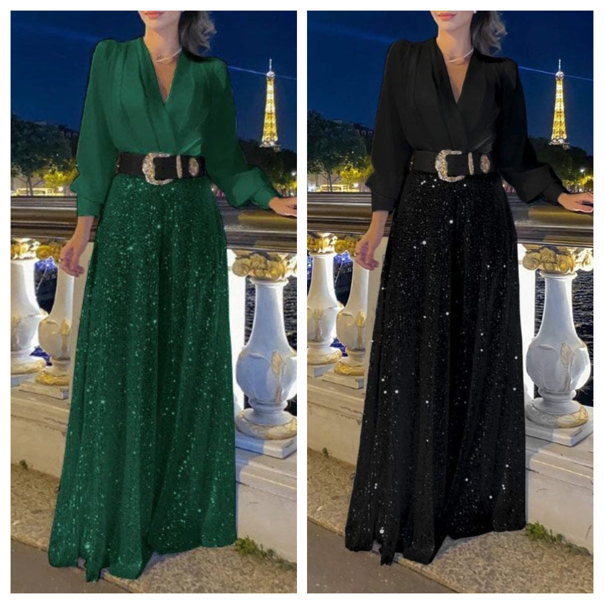 💝Módní tričko s dlouhými rukávy a výstřihem do V + široké kalhoty s flitry-TAB
