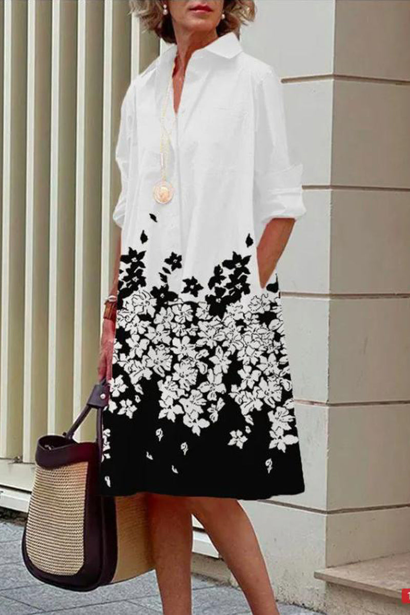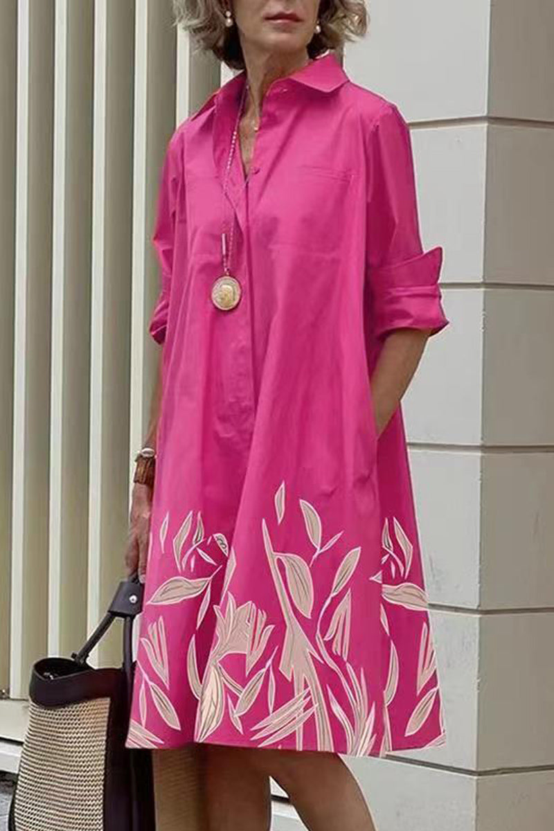 Dámské jednoduché midi šaty s dlouhým rukávem a klopou s potiskem